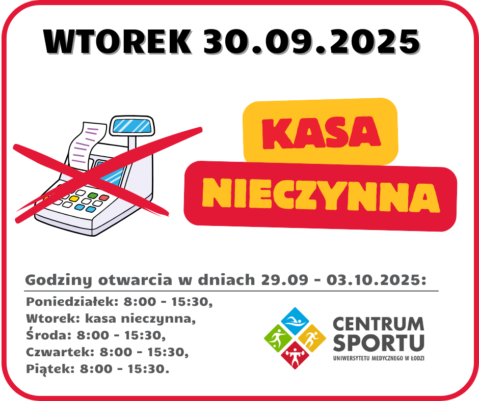 W dniu 30.09.2025r (wtorek) kasa będzie nieczynna, a więc nie będę przyjmowane żadne wpłaty.